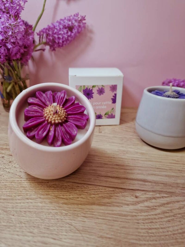 Une bougie coulée à la main dans un joli pot en terre cuite réutilisable, disponible en rose tendre ou gris doux, selon les modèles.