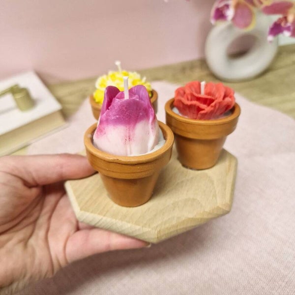 🌸 Voici un cadeau qui ne ressemble à aucun autre. Ce trio de petites bougies fleuries est présenté dans de véritables mini pots de fleurs, fixés sur un plateau en bois naturel. Une création pensée comme une petite scène décorative à offrir… ou à garder jalousement.